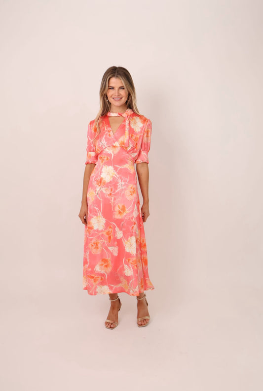 Kate & Pippa kimber coral blossom tie neck midi dress