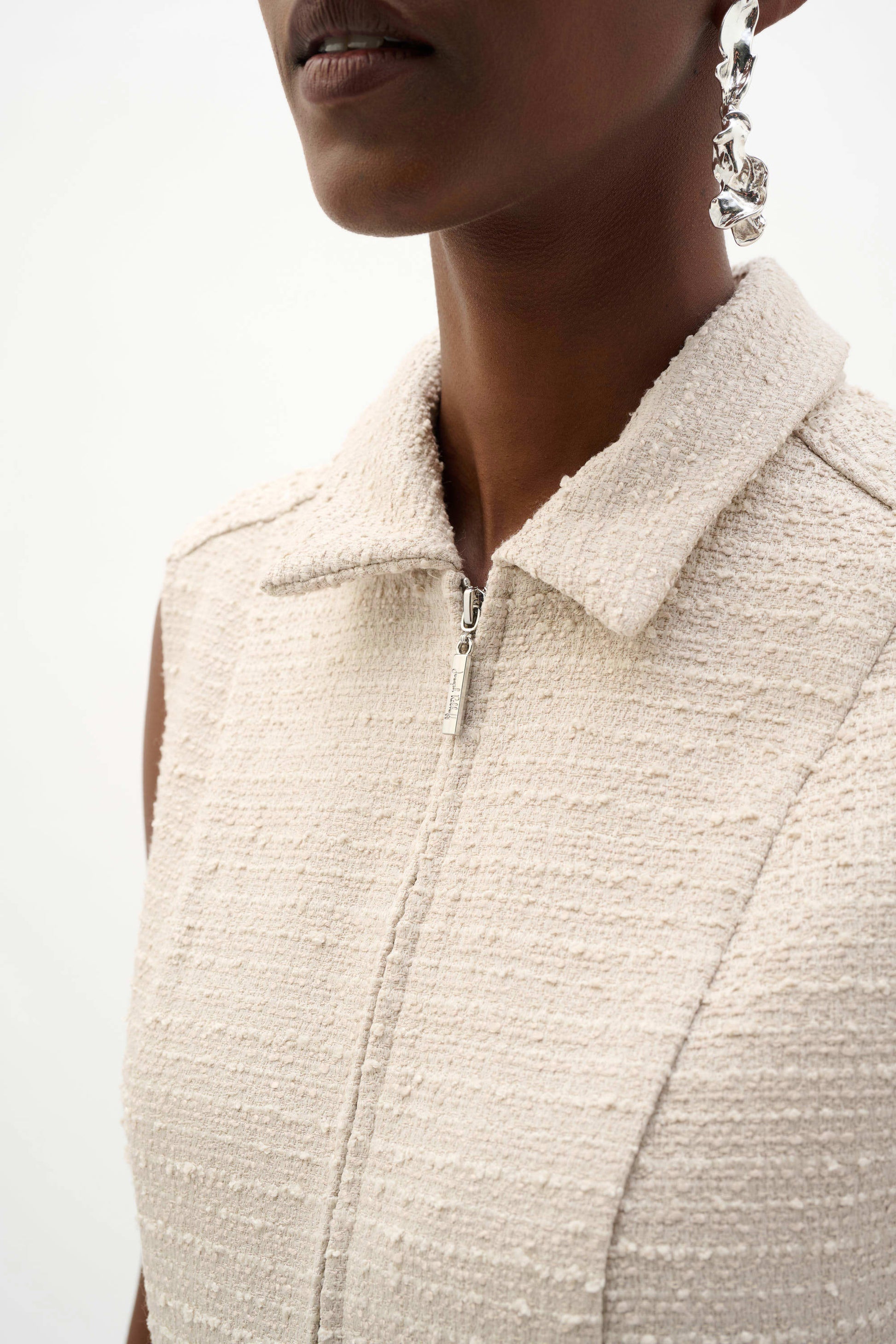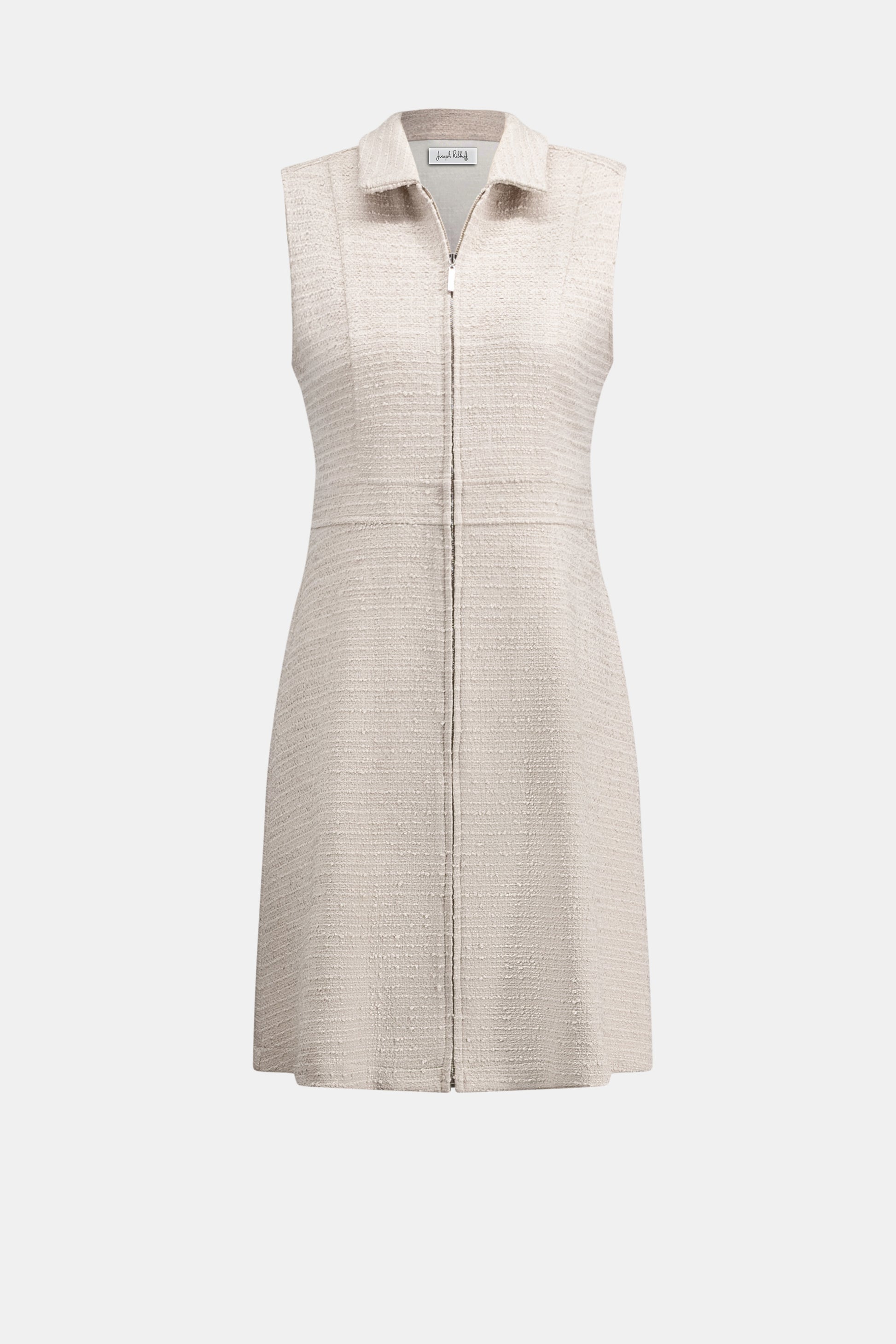 This bouclé A-Line dress pairs a refined shirt collar with a sleek front zip neckline. The sleeveless cut and defined waistband create a flattering shape, while its easy trapeze fit delivers a modern, polished edge.