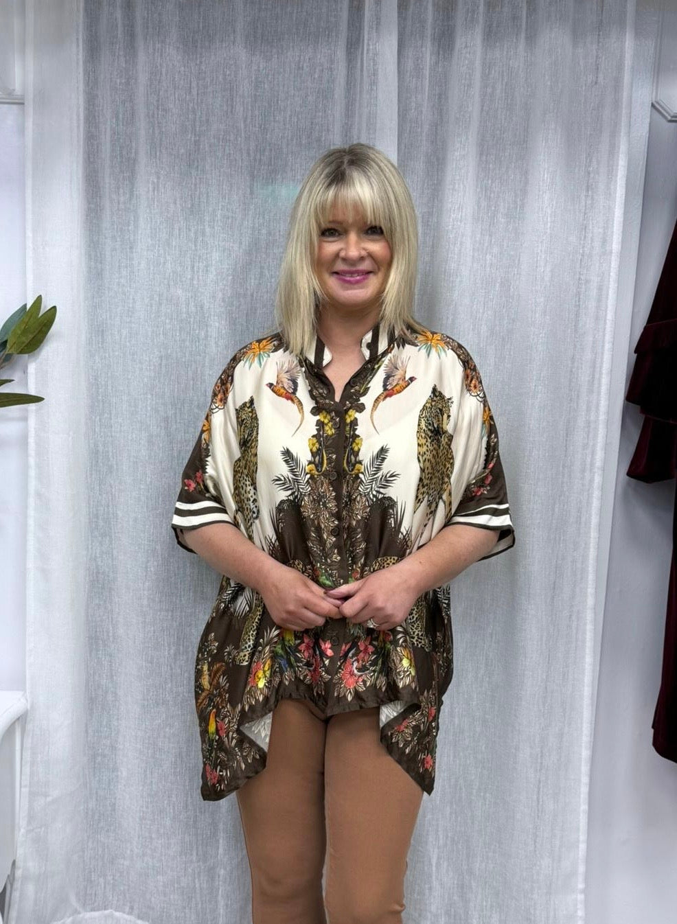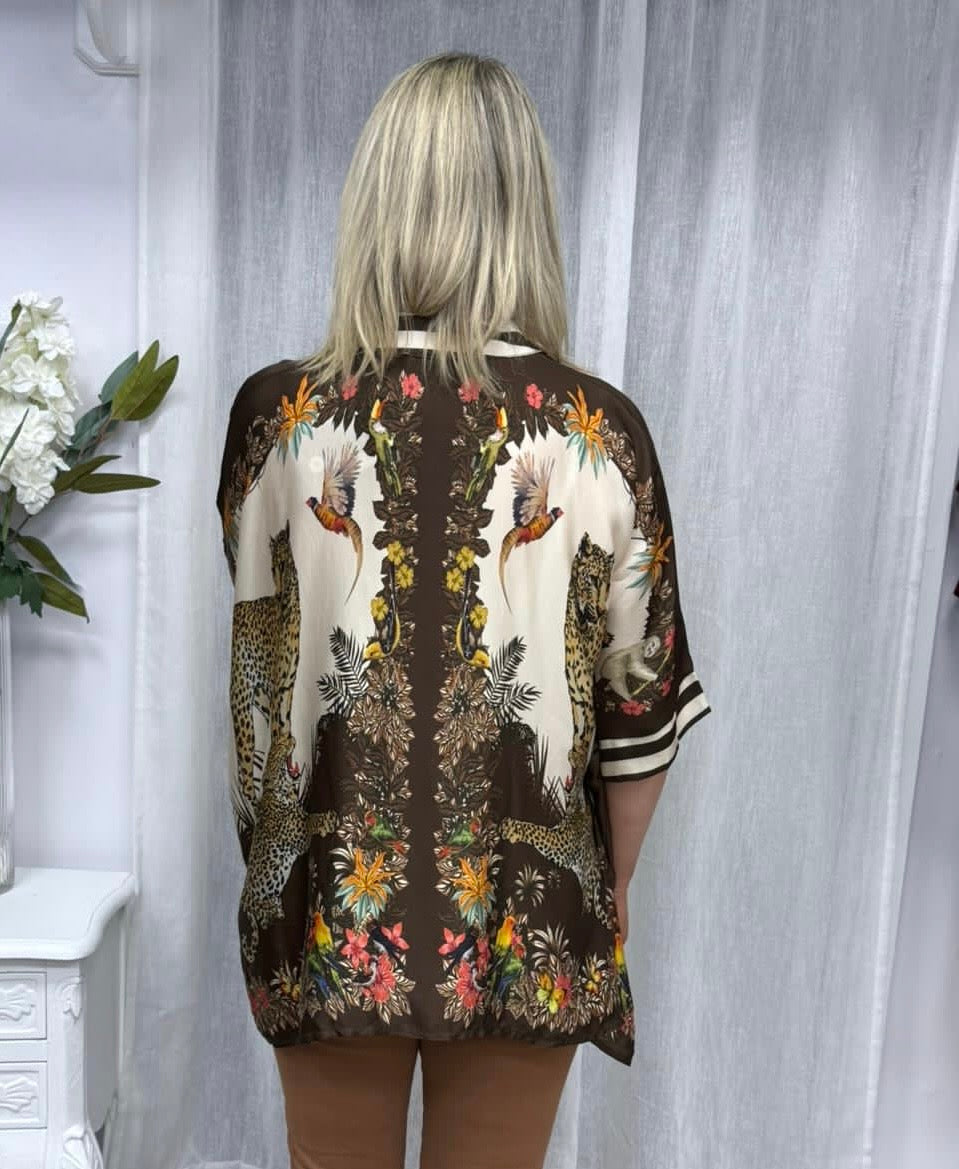 The jacket in the image is a loose, flowy kimono-style top made from a silky, lightweight fabric. It features a bold, intricate print with earthy tones—mainly browns, creams, and hints of orange, green, and yellow. The design includes leopards, tropical foliage, and birds, giving it an exotic, nature-inspired vibe. The sleeves are wide and relaxed, the hemline is asymmetrical (longer at the sides), and there’s a dark brown border detail running along the neckline and down the front. It’s a statement piece—dramatic but comfortable.