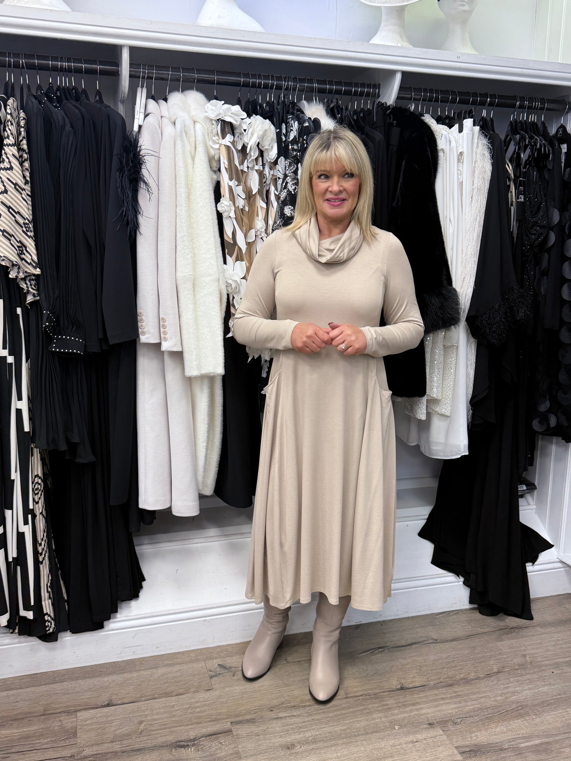 Effortless style meets everyday comfort with this chic Noen cowl neck dress. Designed in a flattering A-line silhouette, it skims beautifully over the body while offering freedom of movement. The soft draped cowl neckline adds a touch of elegance, while the side pockets make it both practical and stylish.