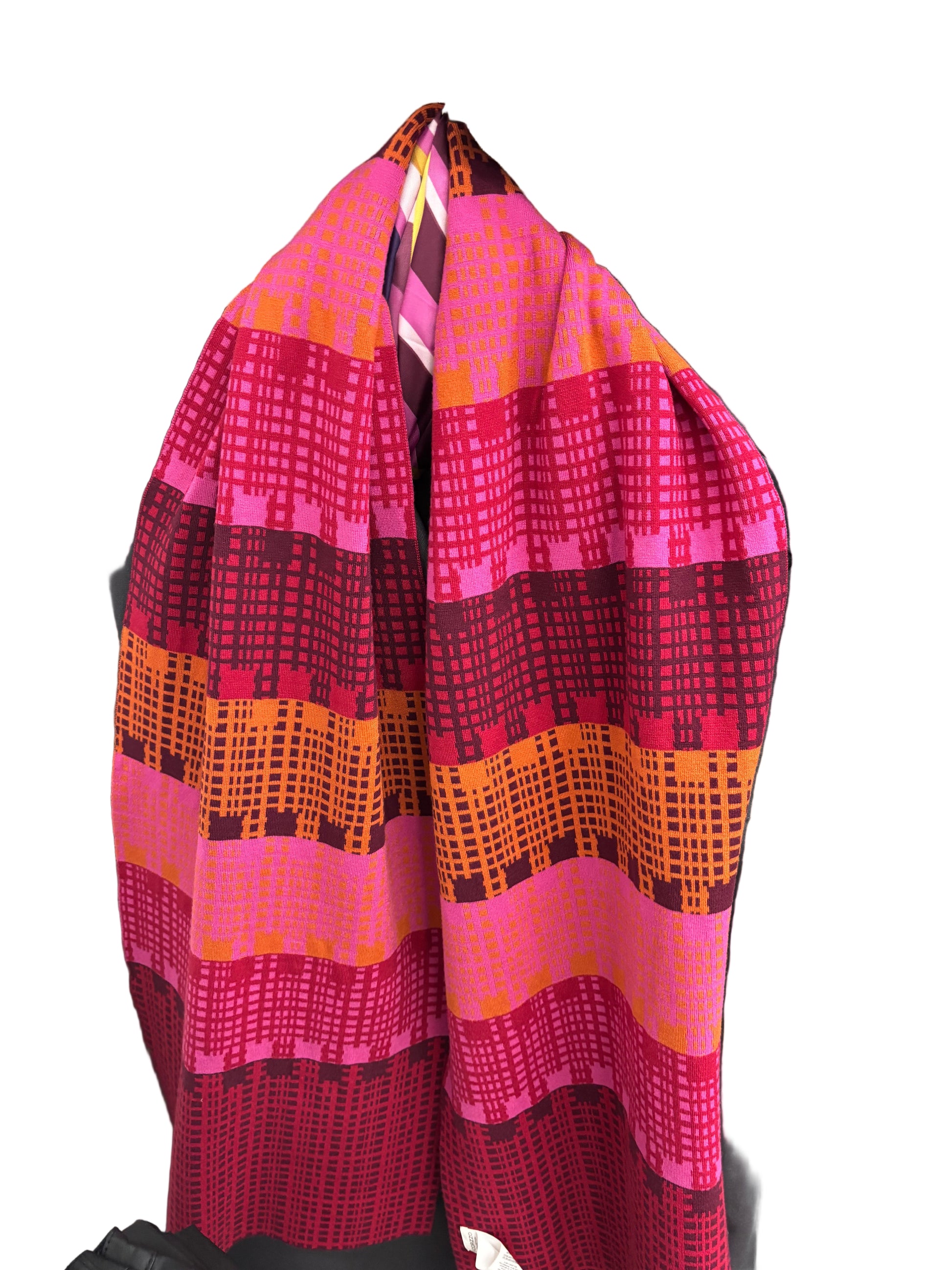 This scarf features a bold and vibrant geometric design with horizontal bands of color in magenta, deep red, orange, and pink. Each stripe has a textured grid-like pattern that adds depth and visual rhythm. The material appears soft and lightweight, perfect for adding a pop of color to neutral outfits. Its energetic mix of warm tones gives it a striking, modern-art vibe—both playful and sophisticated.