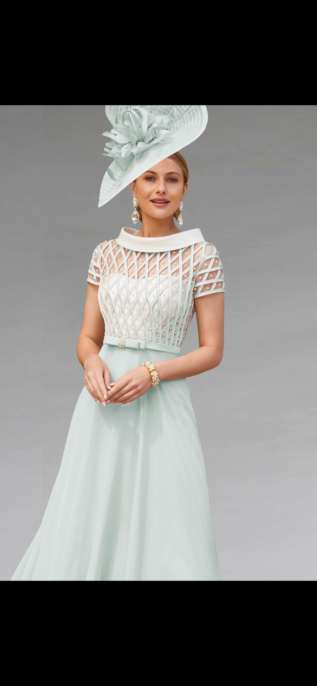 It is a mid-length A-line dress featuring a lattice-detailed bodice with capped sleeves and a high, wide collar over a sweetheart neckline. The dress has a belted waist with a bow and diamante detailing, which leads to a flowing chiffon skirt.